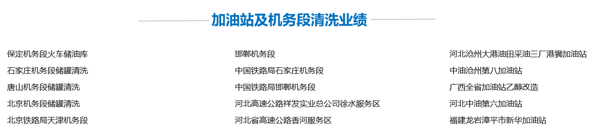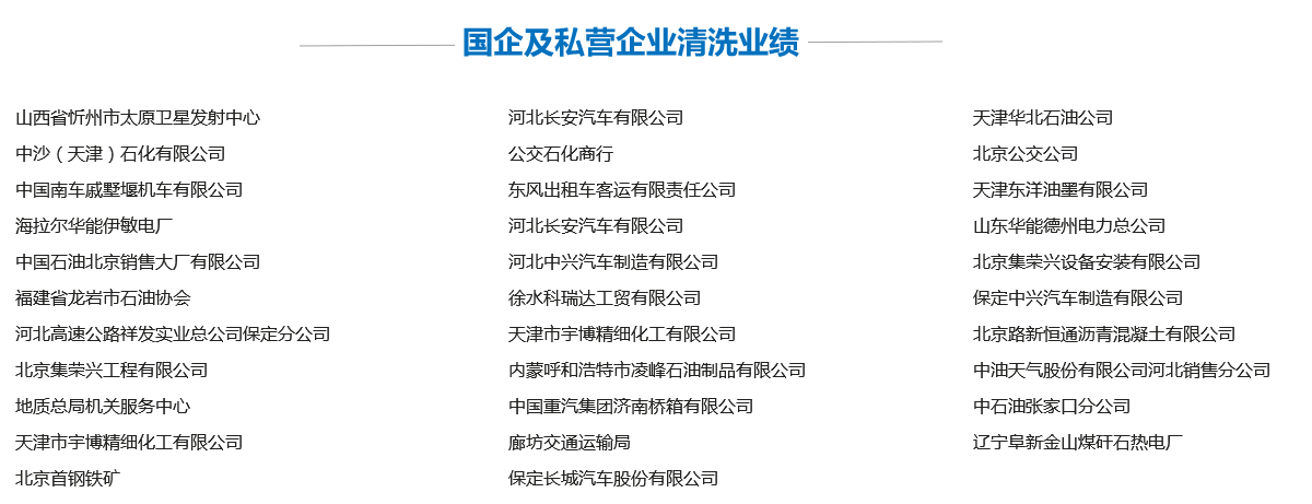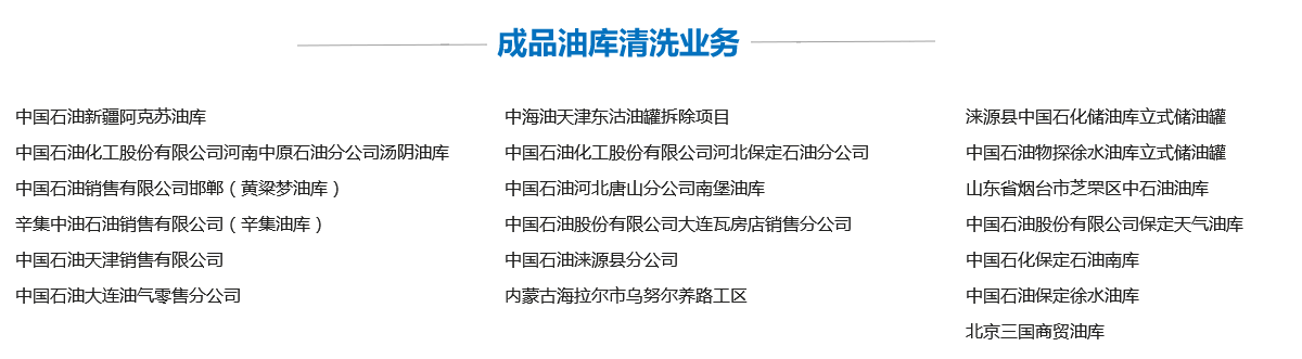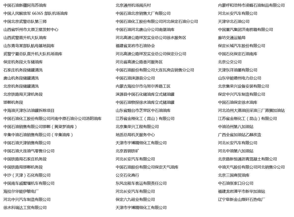 我公司自成立以來,為全國各地國企、部隊(duì)、私營(yíng)企業(yè)清洗油罐、化工儲(chǔ)罐以及大型容器數(shù)萬次,為廣大客戶排憂解難,為客戶質(zhì)量效益提升起到了推動(dòng)作用,并受到客戶的好評(píng),同時(shí)也為本公司積累了豐富不可剝奪的寶貴經(jīng)驗(yàn),其主要業(yè)績(jī)?nèi)缦拢?/span>